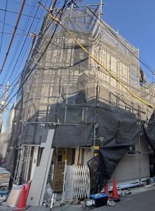 2025年11月22日 / 最終更新日時 : 2025年11月22日 hopes ホテルライクなエントランスホールと屋根バルコニーのある9坪の狭小住宅(2025.08着工) 外壁施工開始 今週は外壁の施工を進めて参りました。 今は足場で外壁材施工後の外観が見えづらいですが、 全貌は足場解体までお楽しみにお待ちください!