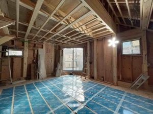 2025年11月8日 / 最終更新日時 : 2025年11月20日 hopes ホテルライクなエントランスホールと屋根バルコニーのある9坪の狭小住宅(2025.08着工) 床暖房施工完了 今週は床暖房工事、床材施工を進めて参りました。 LDKの床に床暖房が施工され、一面が青く染まりました。 この上から床材を施工し、冬でも温かい床で過ごすことが出来るようになります。
