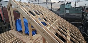 1日で棟上げまで完了し、屋根の下地施工まで進みました。